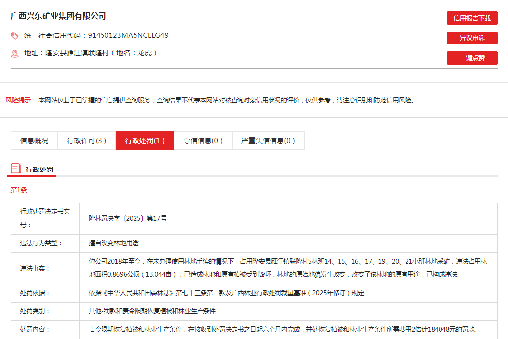 公司基本情况 - 公司全称为广西兴东矿业集团有限公司 [2] - 公司成立于2018年8月28日 [3] - 公司注册资本为1688万元 [3] - 公司法定代表人为刘兴东 [3] - 公司注册地址位于隆安县雁江镇联隆村 [2] 行政处罚详情 - 行政处罚决定书文号为隆林罚决字〔2025〕第17号 [1][2] - 违法行为类型为擅自改变林地用途 [2] - 违法行为发生于2018年至今,在未办理使用林地手续的情况下占用林地采矿 [1][2] - 违法占用林地面积为0.8696公顷(13.044亩) [1][2] - 违法行为导致林地和原有植被毁坏,原始地貌改变,林地用途被改变 [1][2] - 处罚依据为《中华人民共和国森林法》第七十三条第一款及广西林业行政处罚裁量基准(2025年修订) [2] - 处罚类别为罚款和责令限期恢复植被和林业生产条件 [2] - 处罚内容为责令在收到决定书之日起六个月内恢复植被和林业生产条件 [2] - 并处恢复所需费用2倍的罚款,金额为184,048元 [2]