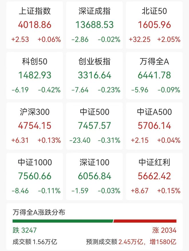 10月30日,A股早盘震荡,创业板指一度跌超1%,截至午盘,沪指涨0.06%,深成指跌0.02%,创业板指跌0.23%。 沪深两市半日成交额1.56万亿,较上个交易日放量1078亿。全市场下跌个股3247只。 | 上证指数 | 深证成指 北证50 | | --- | --- | | 4018.86 | 13688.53 1605.96 | | +2.53 +0.06% -2.86 -0.02% +32.25 +2.05% | | | 科创50 | 创业板指 万得全A | | 1482.93 | 3316.64 6441.78 | | -6.19 -0.42% -7.64 -0.23% -5.96 -0.09% | | | 沪深300 中证500 中证A500 | | | 4754.15 | 7457.57 5706.14 | | +6.31 +0.13% -23.40 -0.31% +2.15 +0.04% | | | 中证1000 | 深证100 中证红利 | | 7560.66 | 6056.84 5662.42 | | -8.46 -0.11% -1.59 -0.03% +8.67 +0.15% | | ...