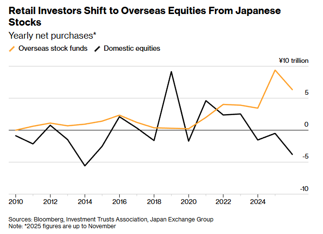 日本的散户投资者无视国内股市的上涨行情,反而将信心寄托在海外股票上。根据媒体汇编的日本交易所集团和日本投资信托协会的数据,截至2025年11 月,日本散户净卖出日本股票及相关投资信托规模达3.8万亿日元(约243亿美元),为十多年来最高水平。而与此同时,日本散户通过投资信托基金对海外股 票的净买入规模徘徊在2024年创纪录的9.4万亿日元附近,显示出散户对外国资产依然保持强劲的配置意愿,这主要受到日元走弱的推动——以日元计价 时,海外股票的价值被放大。 日本散户从日本股票转向海外股票 有散户表示:"我只是认为美国股票拥有更大的潜力。""尤其是在当下,'七巨头'等大型科技公司可能会在人工智能领域的增长中占据主导地位。" 资金外流给日元带来了贬值压力。日本央行加息和更多政府财政支出刺激经济的举措也可能对日元产生影响。值得注意的是,资金外流与日本政策制定者的 目标背道而驰,后者正推动家庭从储蓄转向投资以提高回报率,并将更多现金引导至国内公司以促进增长。 美国银行证券的G10利率和外汇策略全球主管Adarsh Sinha表示:"资金外流是前所未有的。"他提到,日本政府推出的免税投资账户NISA加速了外国股票的 购买, ...