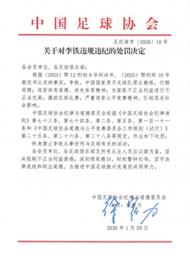 第二批禁足名单出炉 李铁等73人终身禁止从事足球活动