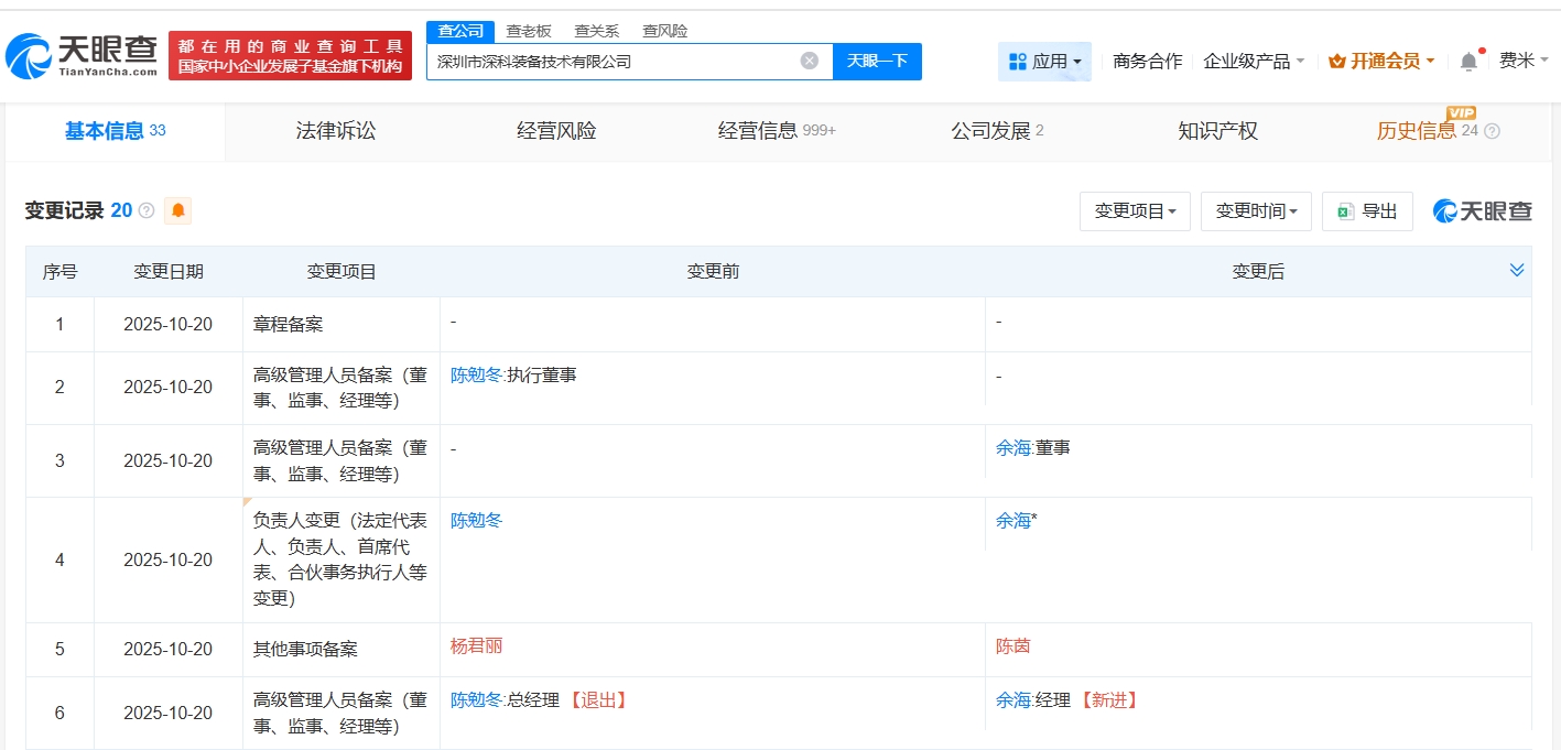| | 深圳市深科装备技术有限公司 × 天眼一下 · NE · 家中小企业发展子其全旗下机构 | 商务合作 1 | | --- | --- | --- | | 基本信息 33 | 法律诉讼 经营风险 经营信息 999+ 公司发展 2 | 知议 | | 工商信息 ● | | | | 工商信息 力史 商信 | | | | 企业名称 | 深圳市深科装备技术有限公司 | | | 法定代表人 | 登记状态 ② 存续 余 会海 天眼评分 2 | | | | 成立日期 2022-02-16 | | | 统一社会信用代码 2 | 91440300MA5H7CCW0A 注册资本 ② 150489万人民币 区 实缴资本 | | | 工商注册号 | 440300215952350 纳税人识别号 ② 91440300MA5H7CCW0A | 组织机构代码 ② | | 营业期限 | 2022-02-16 至 无固定期限 纳税人资质 一般纳税人 核准日期 | | | 企业学理 | 有限责任公司(自然人投资或控股的法人 行业 计算机、通信和其他电子设备制造业 人员规模 | | | | 独资) | | | 参保人数 | 0 2024年报▶ ...