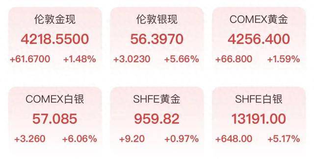 贵金属与基本金属价格表现 - 国际金价持续走高,现货黄金报4218.55美元/盎司,COMEX黄金期货报4256.4美元/盎司,均重新站上4200美元/盎司 [1] - 白银价格显著上涨,现货白银盘中一度突破每盎司56美元,刷新历史纪录,明年3月交货的纽约白银期货价格收于每盎司57.16美元,涨幅达6.6% [3] - 铜价创历史新高,LME铜盘中一度上涨近2.5%,达到每吨11210.50美元,触及纪录新高 [3] - 近十年来COMEX白银价格累计涨幅达301.8% [7] 市场驱动因素 - 美联储降息预期升温,市场预期美联储将在12月降息的概率从一周前的约50%大幅升至近90%,美元指数呈现下跌趋势,推动国际金价反弹至半个月来高点 [5] - 政策转向预期之下,美国银行调升多项金属目标价,将2026年白银、铂金、铜、铝价格预测集体上调 [5] 白银供需基本面 - 世界白银协会预计2025年全球白银开采供应同比持平为8.13亿盎司,回收量虽创13年新高但增幅仅为1%,预计2025年全球白银需求降至11.2亿盎司,同比下降4% [5] - 2026年白银供给预计持续短缺,将继续为银价托底 [5] - 传统工业用银需求稳定,但自2022年起光伏板块成为白银需求的最大变量 [6] 机构价格预测与市场展望 - 高盛重申2026年底金价4900美元/盎司的目标,认为在央行增购和利率下降推动下,明年晚些时候金价可能攀升至每盎司4900美元 [8] - 宝城期货认为近期金价震荡偏强运行,降息预期升温和美元指数走弱给予金价上行动能,但短期盘面对12月降息计价已较为充分,金价上行态势放缓 [8] - 瑞银将白银价格预测上调5至8美元/盎司,预计价格将在2026年达到60美元/盎司,认为未来一年白银还有进一步上涨空间 [8] - 国信期货指出贵金属市场短期预计延续震荡偏强格局,技术面上纽约白银已强势突破54美元/盎司,若能有效站稳下一目标位可上看56美元/盎司附近 [8]