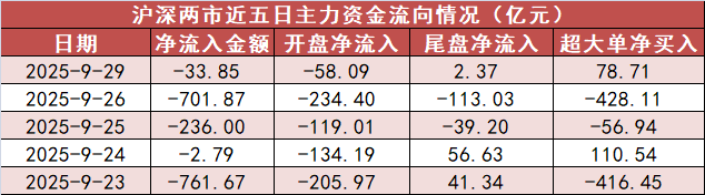 市场整体表现 - 2025年9月29日A股主要指数全线上涨,上证指数收于3862.53点,上涨0.9%,深证成指收于13479.53点,上涨2.05%,创业板指收于3238.01点,上涨2.74%,北证50指数上涨0.69% [1] - 市场合计成交额为21783.94亿元,较上一交易日增加120.53亿元 [1] 主力资金流向 - 当日A股市场全天主力资金净流出33.85亿元,其中开盘净流出58.09亿元,尾盘净流入2.37亿元,超大单净买入78.71亿元 [2][3] - 近五日主力资金流向波动较大,9月23日净流出761.67亿元,9月26日净流出701.87亿元,而9月24日仅净流出2.79亿元 [3] 各板块资金情况 - 沪深300板块当日主力资金净流入63.21亿元,创业板净流入9.22亿元,科创板净流出45.54亿元 [4] - 从近五日数据看,沪深300板块在9月24日净流入80.87亿元,但在9月23日和9月26日分别净流出195.08亿元和197.33亿元 [5] - 各板块尾盘资金均呈净流入,沪深300、创业板、科创板尾盘分别净流入1.62亿元、1.39亿元、0.86亿元 [5] 行业资金流向 - 申万一级行业中21个行业实现资金净流入,非银金融行业净流入200.15亿元居首,涨幅为3.37% [6][7] - 资金净流入前五的行业还包括有色金属(净流入126.53亿元,涨2.36%)、电力设备(净流入117.29亿元,涨2.07%)、电子(净流入92.96亿元,涨1.03%)、机械设备(净流入60.58亿元,涨0.96%) [7] - 资金净流出前五的行业为煤炭(净流出8.60亿元,跌0.61%)、公用事业(净流出6.23亿元,涨0.69%)、纺织服饰(净流出5.93亿元,涨0.27%)、交通运输(净流出5.59亿元,涨0.24%)、社会服务(净流出3.15亿元,跌0.11%) [7] 个股资金与机构动向 - 领益智造主力资金净流入34.54亿元居首 [8] - 龙虎榜数据显示,机构资金净买入天赐材料18014.77万元(涨10.01%)、初灵信息10215.28万元(涨20.00%)、广发证券9877.84万元(涨10.02%)、领益智造8599.27万元(涨9.99%) [9][11] - 机构资金净卖出幅度较大的个股包括新光光电(净卖出14378.55万元,跌17.56%)、华软科技(净卖出7287.98万元,跌10.02%) [11] 机构关注个股 - 多家机构发布最新个股评级,乔锋智能获东北证券买入评级,目标价110.56元,较最新收盘价76.83元有43.90%上涨空间 [12] - 恒瑞医药获华泰证券买入评级,目标价103.21元,较最新收盘价69.20元有49.15%上涨空间,珀莱雅获东方证券买入评级,目标价116.85元,较80.82元收盘价有44.58%上涨空间 [12] - 其他被关注的个股包括利安隆(华创证券强推,上涨空间13.40%)、中信证券(瑞银证券买入,上涨空间41.50%)、长安汽车(东方证券买入,上涨空间30.30%)等 [12]