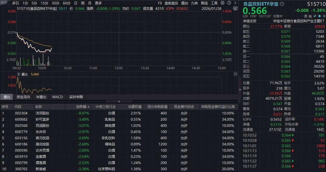 市场表现 - 2026年1月26日,食品饮料ETF华宝(515710)场内价格下跌1.39% [1] - 板块内白酒股跌幅居前,其中洋河股份大跌近9%,古井贡酒、水井坊、金徽酒、酒鬼酒等多股跌超2% [1] - 截至1月23日收盘,食品饮料ETF华宝(515710)标的指数细分食品指数市盈率为19.39倍,位于近10年来1.76%分位点的低位 [3] 行业动态 - 1月24日,“i茅台”平台因订单量猛增与冬季天气变化影响物流,新增南京与北京两处发货仓,以优化购酒体验 [2] - 分析认为,此举是应对飞天茅台上架后订单激增的务实举措,也是茅台市场化转型的重要配套动作,实现了从单一贵阳仓到京津冀、华东核心区域的辐射 [3] - 白酒行业整体需求呈弱修复态势,近期头部酒企批价企稳、库存回落,随着春节临近终端备货需求逐步启动 [4] 机构观点 - 中信建投指出,跨年行情或呈现“成长先行、白酒蓄力”的特征,市场资金更倾向于布局零食、乳业等景气度明确、弹性更高的赛道 [4] - 预计春节后随着消费场景修复与需求集中释放,白酒或将迎来估值修复行情 [4] - 有机构表示,叠加经济预期边际改善,白酒板块估值中枢存在阶段性修复可能,短期建议关注部分白酒龙头 [4] 产品信息 - 食品饮料ETF华宝(515710)跟踪中证细分食品饮料产业主题指数,约6成仓位布局高端、次高端白酒龙头股,近4成仓位兼顾饮料乳品、调味、啤酒等细分板块龙头股 [4] - 该ETF的前十权重股包括“茅五泸汾洋”、伊利股份、海天味业等 [4] - 场外投资者可通过食品饮料ETF华宝联接基金(A类012548/C类012549)进行布局 [5]