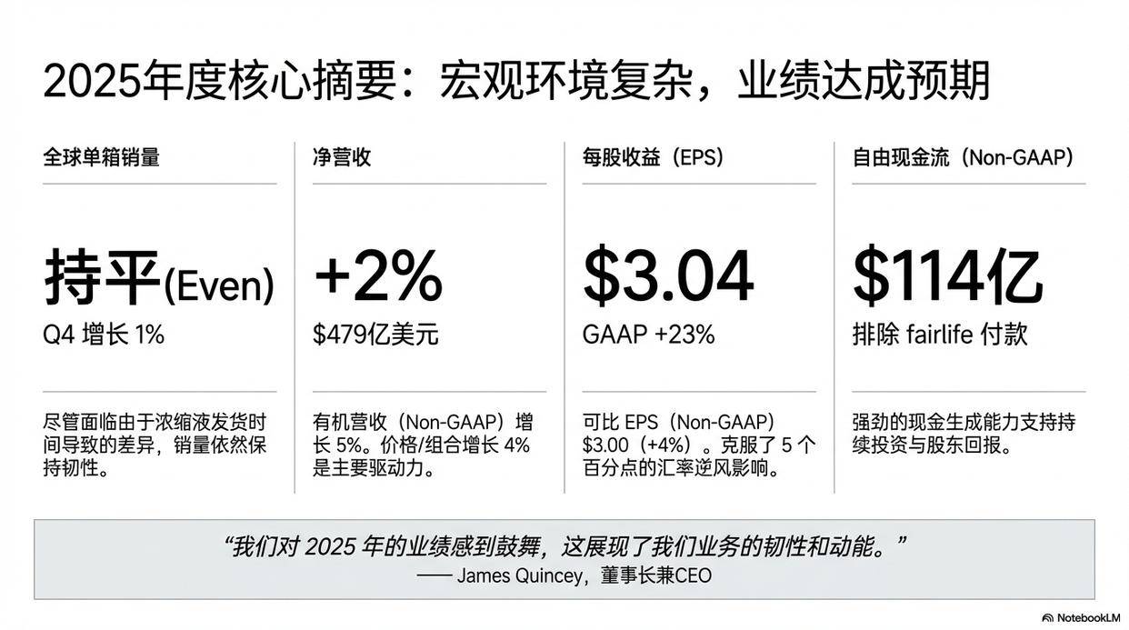 核心观点 - 公司2025年第四季度业绩略超预期,但2026年增长指引疲软,引发市场对增长引擎减速的担忧,股价盘前一度下跌4.1% [1][3][5] - 公司正从过去几年依靠提价驱动增长的模式,回归到更温和的常态化增长 [6] - 公司面临消费者健康意识提升、宏观政策压力以及核心品类需求变化等结构性挑战,正加速向非糖饮料等多元化品类扩张 [6][11] 2025年第四季度及全年财务表现 - **营收与增长**:四季度营收118.2亿美元,同比增长2%;有机收入增长5% [1]。价格/组合增长4%是主要驱动力 [2]。全年净营收479亿美元 [2] - **每股收益**:四季度可比每股收益为0.58美元,同比增长6%,略高于分析师预期 [1]。全年可比每股收益为3.00美元,同比增长4%,克服了5个百分点的汇率逆风影响 [2] - **销量表现**:四季度全球单箱销量增长1% [9]。尽管面临浓缩液发货时间差异,销量保持韧性 [2] - **现金流**:全年自由现金流为114亿美元,展现出强劲的现金生成能力 [2] 2026年业绩指引 - **有机收入增长指引**:预计2026年全年有机销售额增长在4%至5%之间,该指引区间下限低于华尔街平均预期的5.01% [3][6] - **每股收益增长指引**:预计在2025年3.00美元的基础上,可比每股收益将增长7%至8%(包含约3%的汇率顺风) [6] 各业务板块与产品表现 - **明星产品**:无糖可口可乐四季度销量激增13%,全年增长14% [9] - **传统产品**:由于消费者需求减弱,传统全糖汽水销量面临压力 [9] - **其他品类**:水、运动饮料、咖啡和茶业务四季度销量增长3% [9]。果汁、乳制品和植物基饮料销量下滑3%,主要受亚太和欧洲、中东及非洲地区拖累 [9] - **健怡可乐**:四季度增长2%,全年持平 [9] 重大事件与资产减值 - **BodyArmor减值**:四季度计提了与运动饮料品牌BodyArmor商标相关的9.6亿美元非现金减值费用,导致当季GAAP营业利润同比下滑32% [2][8] - **北美市场影响**:此次减值导致四季度北美地区营业利润同比暴跌65% [8] - **北美基本面**:剔除减值因素后,北美市场四季度单箱销量增长1%,价格/组合增长4%,可比货币中性营业利润增长15% [8] 行业趋势与宏观挑战 - **健康化趋势**:消费者正从传统高热量软饮料转向更健康的选择,含糖饮料面临逆风 [6][11] - **政策压力**:美国部分州已开始限制使用食品援助福利购买软饮料,直接冲击低收入群体消费能力;特朗普政府对碳酸饮料不健康的尖锐表态构成潜在威胁 [5][11] - **公司应对策略**:公司正加速产品组合多元化,大力推广如Powerade Power Water等创新产品,并通过全球体育赛事营销强化运动和健康属性以对冲风险 [11]