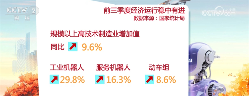从发展动能看,以人工智能为代表的新质生产力加快向现实生产力转化,前三季度,规模以上高技术制造业增加值同比增长9.6%;工业 机器人、服务机器人、动车组等产品产量分别增长29.8%、16.3%、8.6%。 而科技和产业融合也让更多创新成果从"实验室"走到"生产线",创新"势能"向经济"动能"不断转化。3D打印设备、工业控制计算机及系统 产量分别增长40.5%、98.0%。新兴产业持续向高端化、智能化、绿色化转型。前三季度,规模以上风力发电、太阳能发电量同比均实现两位 央视网消息:前三季度,在政策与市场双轮驱动下,我国科技创新和产业创新亮点颇多,来看亮点梳理。 此外,创新成果竞相迸发,创新能力有效提升。前三季度,汽车制造业、铁路船舶航空航天和其他运输设备制造业投资同比保持两位数增 长。在创新投入持续加力的驱动下,国内涌现出多个达到国际先进水平的通用大模型,世界知识产权组织最新发布的报告显示,2025年我国创 新指数首次跻身全球前十,24个创新集群成为全球百强,入围数量连续3年居全球首位。 数增长;新能源汽车、汽车用锂离子动力电池等新能源产品产量分别增长29.7%、46.9%;"两重""两新"政策为绿色循环产业发展 ...