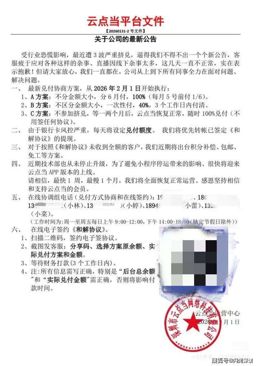 事件概述 - 线上黄金平台“云点当”出现兑付异常 金料和余额无法提现 其微信小程序已无法打开[1] - 有投资者账户中约4000元资金无法提现[1] - 公司关联主体为深圳市云点当网络科技有限公司 成立于2024年 位于深圳罗湖水贝社区[1] 公司应对措施 - “云点当”于2月1日发布公告 称受行业恐慌影响 最近遭3波严重挤兑[2] - 公司向用户提供三个兑付方案:方案一为不分金额大小分6个月100%兑付 每月5号前付1/6;方案二为不区分金额大小一次性兑付40% 3个工作日内付清;方案三为不参加挤兑 等一两个月后公司恢复正常随时100%兑付[2] - 公司每天设定兑付额度 优先转账已签订《和解协议》的提现 公告中附有二维码供用户扫码签约电子版《和解协议》[4] 投资者反应与现状 - 有投资者因担心恐慌性挤兑 在事件发生前已将平台账户资金提现[1] - 部分投资者不同意公司提出的兑付方案 因此没有签字[4] - 部分用户不想接受兑付40%的方案 也担心6个月时间太长出现变化 仍想等一等再做决定[4] - 2月2日 红星资本局致电公告中6位“云点当”兑付协调负责人 所有号码均处于无法接通状态[4] 行业背景 - 此前 同位于水贝的金店“杰我睿”已出现兑付危机 自1月19日起其线上平台无法正常提现和提取实物黄金[4] - 1月31日 深圳罗湖区工作专班发布情况通报 在工作专班督促下 杰我睿公司已处置资产、筹集资金并启动兑付 同时委托第三方专业机构对公司经营情况进行审计 初步结果显示网传金额明显夸大[4]