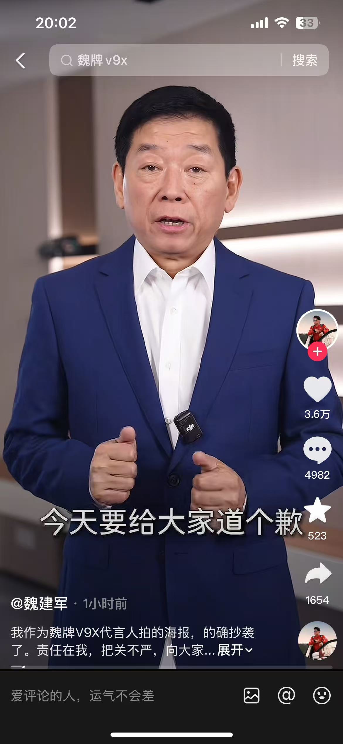 事件概述 - 长城汽车董事长魏建军于3月6日晚间就“魏牌新车海报涉嫌抄袭”风波作出公开回应,承认抄袭事实并致歉 [1] - 魏建军在视频声明中表示,经过核查,魏牌V9X代言人海报的确存在抄袭,不能有任何辩解 [1] 公司回应与责任认定 - 魏建军以魏牌V9X代言人身份承认其拍摄的海报的确抄袭,并表示责任在于其本人,把关不严 [3][6] - 魏建军及长城汽车愿意承担此次事件带来的全部法律与经济责任 [1] - 公司向路虎品牌、原版海报创作者及广大网友表达了歉意 [1] 事件影响 - 该抄袭风波近期引发了市场热议 [1] - 相关社交媒体内容在短时间内获得了一定关注度,例如一条相关动态在发布1小时内获得了498次转发和165条评论 [5][6]