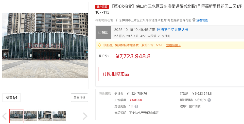 毕竟作为该项目的第四次拍卖,与首次挂牌价的1293.74万元相比,起拍价整整下调了576万! 而该法拍单元正是恒福新里程的营销中心位置,共有7间商铺打通而成,全部有抵押和查封,总建面1243.28㎡。 万万没想到,佛山的售楼部能有这么好卖!近日,乐居梳理法拍信息时发现,今年年中挂牌的三大售楼部居然无一例外的全部被接手,最多激战28轮,最 高溢价55万!事不宜迟,让我们一起来回顾一下这波售楼部的"高光时刻"!恒福新里程溢价55万!法拍四次终成交10月16日,经过21轮的报价,恒福新里 程花园二区1座107-113最终以772.39488万成交,溢价55万整,共有两名买家参拍。 | | | | 房屋建筑 | 评估价 | 土地/房屋 | 抵押 | 查封 | 其他情况 | | --- | --- | --- | --- | --- | --- | --- | --- | --- | | 序号 | 坐落 | 权利证号 | 面积 (m') | (万元) | 用途 | 情况 | 情况 | | | | 佛山市三 水区云东 | 學(201 | | | | | | | | 1 | 海街道德 兴北路1号 | 7) 佛三不 | 14 ...