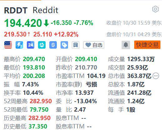 | RDDT Reddit | | | | --- | --- | --- | | 194.420 ↓ -16.350 -7.76% | | 收盘价 10/30 15:59 美东 | | 219.530 ↑ 25.110 +12.92% | | 盘前价 10/31 04:29 美东 | | 一 7 24 4 (8 8 日 (0 日 (2 日 (2) 2 | | ● 快捷交易 | | 最高价 209.470 | 开盘价 209.410 | 成交量 1295.33万 | | 最低价 193.810 昨收价 210.770 | | 成交额 25.93亿 | | 平均价 200.208 | | 市盈率TTM 104.19 总市值 363.87亿 (1) | | 市盈率(静) 亏损 振 幅 7.43% | | 总股本 1.87亿 | | 换手率 10.44% 市净率 13.937 | | 流通值 241.28亿 | | 52周最高 282.950 委 比 -13.04% | | 流通股 1.24亿 | | 52周最低 79.750 量 比 2.47 | | 每 手 1股 | | 历史最高 282.950 股息TTM - ...