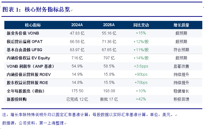 报告投资评级 - 增持 [1] 核心观点 - 公司2025年营运利润和新业务价值(NBV)增长稳健,股东回报政策持续,股息增长并启动新一轮股份回购 [2][3] - 公司在中国香港市场增长强劲,中国内地市场增长势头有望延续,东南亚市场具备潜力,区域扩张战略稳步推进 [4][7] - 代理渠道是公司新业务价值的主要贡献者,伙伴分销渠道增长迅速 [5][6] - 基于对公司前景的看好,报告维持“增持”评级,并给出了未来三年的盈利预测 [7] 财务业绩总结 (2025年全年) - 税后营运利润:71.36亿美元,同比增长8%(实际汇率)[2] - 归母净利润:62.34亿美元,同比下降8.8%(实际汇率),但剔除汇率影响后为77.46亿美元,同比增长30% [3] - 内含价值:768.11亿美元,同比增长11%(实际汇率)[2] - 新业务价值:55.16亿美元,同比增长17%(实际汇率)[2] - 新业务价值利润率:58.5%,同比提升4个百分点 [2] - 年化新保费:94.84亿美元,同比增长10% [4] - 全年股息:每股1.93港元,同比增长10% [2] - 股份回购:董事会批准实施新一轮17.43亿美元股份回购 [2][3] 分地区业务表现 - 中国香港:新业务价值同比增长28%,占整体NBV的38%,增长由本地客户(+21%)和中国内地访客(+35%)共同驱动,对公司全年NBV贡献度超60% [4] - 中国内地:新业务价值同比增长2%,其中下半年同比增长14.3%,增长势头延续至2026年前两个月,增速超20% [4] - 泰国:新业务价值同比增长22%,主要受益于监管变动带来的一次性销售,推动新业务价值率大幅提升 [4] - 新加坡:新业务价值同比增长17%,受益于代理和伙伴分销渠道的双位数增长 [4] - 马来西亚:新业务价值同比增长7%,受益于下半年代理渠道逐季改善 [4] - 其他地区:新业务价值同比增长4% [4] 分渠道业务表现 - 代理渠道:新业务价值同比增长15%至42.73亿美元,贡献了整体NBV的73%,新业务价值率同比提升3.9个百分点至71.5% [5] - 伙伴分销渠道:新业务价值同比增长22%至15.93亿美元,新业务价值率同比提升3.7个百分点至45.4% [5] - 银保渠道(伙伴分销内):新业务价值同比增长20%,新业务价值率保持在40%以上 [6] 未来盈利预测与估值 - 预计保险收益:2026-2028年分别为242.03亿美元、260.74亿美元、281.05亿美元 [7][8] - 预计归母净利润:2026-2028年分别为77.01亿美元、83.54亿美元、89.21亿美元 [7][8] - 预计每股收益(EPS):2026-2028年分别为0.54美元、0.59美元、0.63美元 [7] - 基于2026年3月23日收盘价79.35港元计算,2026-2028年预测市盈率内含价值倍数(PEV)分别为1.72倍、1.60倍、1.50倍 [7]