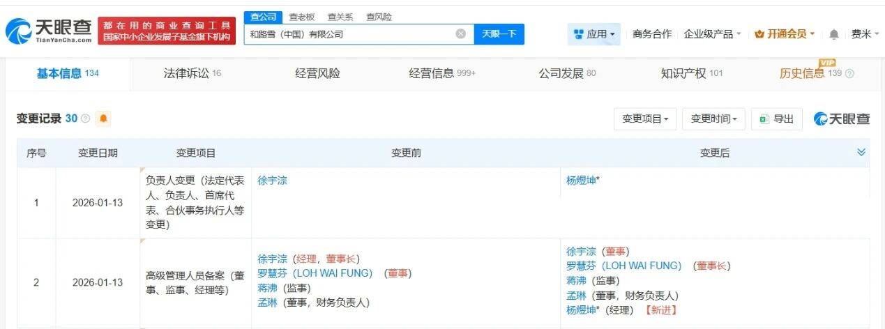 公司高层人事变动 - 和路雪(中国)有限公司近期发生工商变更,法定代表人、经理、董事长徐宇淙改任董事 [1] - 杨煜坤接替徐宇淙担任法定代表人及经理职务 [1] - 罗慧芬(LOH WAI FUNG)接任公司董事长职务 [1] 公司基本信息 - 和路雪(中国)有限公司成立于1993年5月,注册资本为1.8亿美元 [1] - 公司经营范围涵盖食品生产、粮食加工食品生产、饮料生产等 [1] - 该公司由梦龙投资(上海)有限公司全资持股 [1]