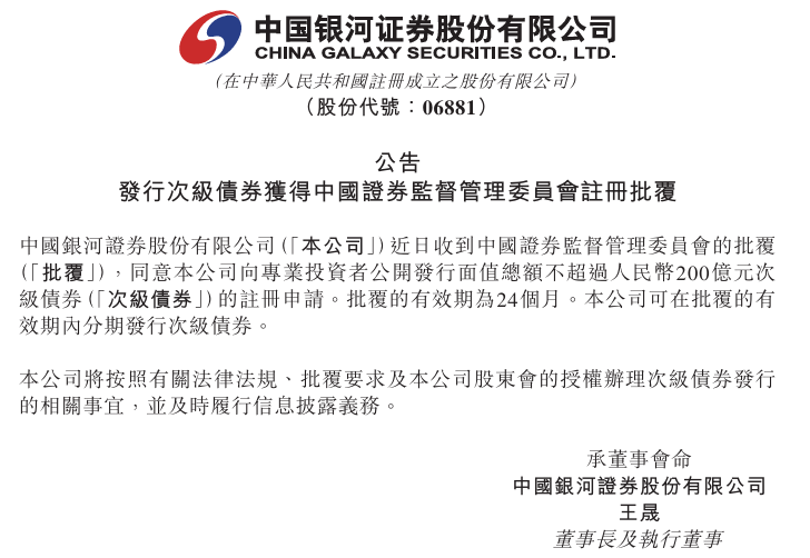 中国银河拟发行不超过200亿次级债券,获中国证监会注册批复