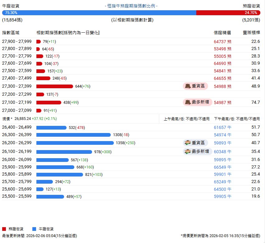 恒生指数牛熊证街货分布概况 - 牛证总街货量以相对期指张数计算为15,854张,占市场总街货的75.30% [2] - 熊证总街货量以相对期指张数计算为5,201张,占市场总街货的24.70% [2] - 恒生指数现价为26,885.24点,较前上涨37.92点,涨幅0.1% [2] 熊证街货分布详情 - 熊证街货重货区位于27,300-27,399点区间,该区间最新熊证数量为644张,较上一交易日增加76张 [1][2] - 熊证街货最多新增区间为27,100-27,199点,该区间最新熊证数量为438张,较上一交易日增加99张 [1][2] - 在27,500-27,599点区间,熊证数量为157张,较上一交易日增加23张 [2] - 在27,400-27,499点区间,熊证数量为248张,较上一交易日减少65张 [2] 牛证街货分布详情 - 牛证街货重货区位于26,200-26,299点区间,该区间最新牛证数量为1,358张,较上一交易日增加250张 [1][2] - 牛证街货最多新增区间为26,100-26,199点,该区间最新牛证数量为978张,较上一交易日增加308张 [1][2] - 在26,300-26,399点区间,牛证数量为1,308张,较上一交易日减少18张 [2] - 在25,800-25,899点区间,牛证数量为821张,较上一交易日增加103张 [2]