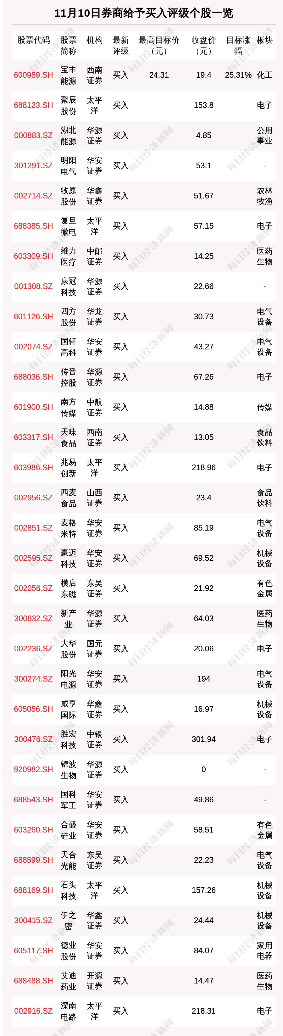 11月10日68只个股获券商关注,宝丰能源目标涨幅达25.31%