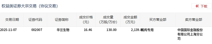 大宗交易概况 - 2025年11月7日,华兰生物发生大宗交易,成交130万股,成交金额为2139.8万元 [1][2] - 该笔大宗交易成交价16.46元,与当日市场收盘价持平 [1][2] - 该笔交易占公司当日总成交额的6.49% [1] 交易细节 - 交易证券代码为002007,证券简称为华兰生物 [2] - 买方营业部为机构专用,卖方营业部为中国国际金融股份有限公司上海分公司 [2]