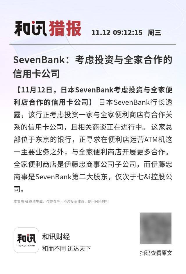 公司战略动向 - SevenBank正考虑投资一家与全家便利商店有合作关系的信用卡公司,相关商谈正在进行中[1][2] - 公司寻求在便利店运营ATM机这一主要业务之外,与全家便利商店开展更多合作[1][2] 公司股权结构 - 全家便利商店是伊藤忠商事公司的子公司[1][2] - 伊藤忠商事是SevenBank的第二大股东,持股比例仅次于七&i控股公司[1][2] 公司基本信息 - SevenBank是一家总部位于东京的银行[1][2]