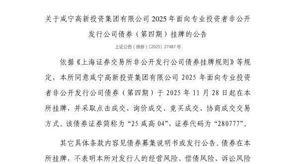 债券挂牌基本信息 - 咸宁高新投资集团有限公司2025年面向专业投资者非公开发行公司债券(第四期)获上海证券交易所批准挂牌 [1] - 该债券将于2025年11月28日起在上海证券交易所挂牌交易 [2] - 债券证券简称为"25咸高04",证券代码为"280777" [2] 交易方式 - 债券挂牌后采取点击成交、询价成交、竞买成交、协商成交等多种交易方式 [2] - 该债券发行面向专业投资者且为非公开发行 [1][2]