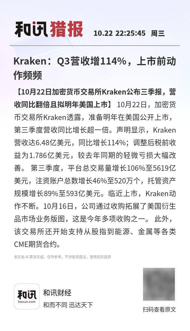 【10月22日加密货币交易所Kraken公布三季报,营收同比翻倍且拟明年美国上市】10月22日,加密货 币交易所Kraken透露,准备明年在美国公开上市,第三季度营收同比增长超一倍。声明显示,Kraken营 收达6.48亿美元,同比增长114%;调整后税前收益为1.786亿美元,较去年同期的轻微亏损大幅改善。 第三季度,平台总交易量增长106%至5619亿美元,注资账户总数增长46%至520万个,托管资产规模增 长89%至593亿美元。临近上市,Kraken动作不断。10月16日,公司通过收购拓展了美国衍生品市场业 务版图,这是今年多项收购之一。 此外,该交易所还开始支持从股指到能源、金属等各类CME期货合 约。 本文由 AI算法生成,仅作参考,不涉投资建议,使用风险自担 本文由 Al 算法生成,仅作参考,不涉投资建议,使用风险自担 和讯财经 FUL hexun.con 和而不同 迅达天下 扫码查看原文 ...