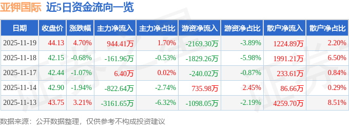 亚钾国际(000893)11月19日主力资金净买入944.41万元