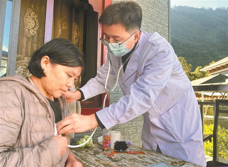 图为林芝市墨脱县格当乡卫生院的医生入户为群众开展诊疗服务