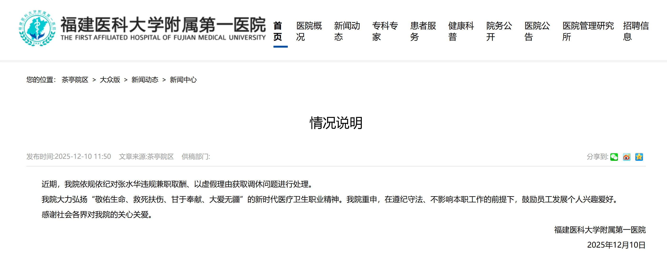 福建医科大学附属第一医院通报:对张水华违规兼职取酬、以虚假理由获取调休问题进行处理