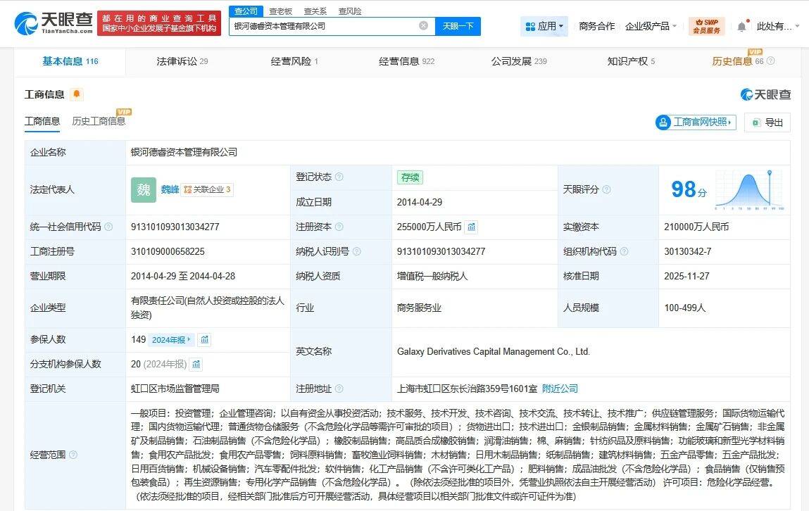公司基本信息 - 银河德睿资本管理有限公司成立于2014年4月29日,法定代表人为魏峰 [1][2] - 公司注册资本由21亿人民币增至25.5亿人民币,增幅约21% [1] - 公司登记状态为存续,营业期限至2044年4月28日,登记机关为虹口区市场监督管理局 [2] - 公司类型为有限责任公司(自然人投资或控股的法人独资),行业分类为商务服务业 [2] - 公司人员规模为100-499人,2024年参保人数为149人,分支机构参保人数为20人 [2] 股权结构与股东信息 - 公司由中国银河(601881.SH)旗下银河期货有限公司全资持股 [1][2] 经营范围 - 经营范围包括投资管理、企业管理咨询、以自有资金从事投资活动、货物进出口、金银制品销售、金属材料销售、再生资源销售等 [1] - 具体业务涵盖技术服务、供应链管理、国际货物运输代理、化工产品销售、危险化学品经营等广泛领域 [2] 公司发展动态 - 公司近期发生工商变更,注册资本增加4.5亿人民币,核准日期为2025年11月27日 [1][2]