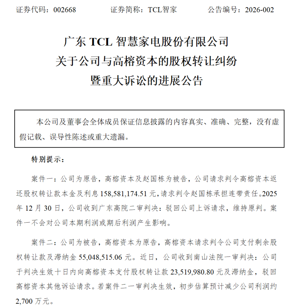 诉讼案件概述 - TCL智家发布关于与高榕资本股权转让纠纷的重大诉讼进展公告 [1] - 案件涉及两起诉讼,均源于约10年前对中融金(北京)科技有限公司的股权收购交易 [5] - 案件一中TCL智家为原告,案件二中TCL智家为被告 [1][4] 案件一(TCL智家为原告)详情与进展 - TCL智家请求判令高榕资本返还股权转让款本金6528万元及利息9330万元,暂合计1.59亿元,并请求判令赵国栋承担连带责任 [4][5] - 深圳市中级人民法院一审判决驳回公司诉讼请求,2025年12月30日广东高院二审判决驳回上诉,维持原判 [4][6] - 该案件不会对公司本期或期后利润产生影响 [7] 案件二(TCL智家为被告)详情与进展 - 高榕资本请求判令TCL智家支付剩余股权转让款本金2352万元及逾期付款滞纳金 [1][6] - 滞纳金按每日千分之一计算,暂计至2023年7月11日为3152.85万元 [6] - 2026年1月23日,南山法院一审判决公司需向高榕资本支付股权转让款2352万元及滞纳金,驳回高榕资本其他诉讼请求 [1][7] - 若一审判决生效,初步估算预计减少公司利润约2700万元 [1][7] 历史交易背景 - 2015年10月,高榕资本、赵国栋等以6.12亿元将中融金51%股权转让给TCL智家(当时为奥马电器),其中高榕资本转让2.55%股权,获转让款4960万元 [5] - 2017年4月,高榕资本等以7.84亿元将中融金剩余49%股权转让给公司,其中高榕资本转让2.45%股权,合同约定转让款3920万元 [5] - 高榕资本于2015年5月以2000万元入股中融金占5%注册资本,其在2015年10月转让部分股权时,股权价值在5个月内增值近5倍 [5] 公司基本情况与近期业绩 - TCL智家原名奥马电器,主营业务为家用冰箱、冷柜及洗衣机的研发、生产及销售 [7] - 公司控股股东为TCL家电集团有限公司,实际控制人为李东生 [7] - 2025年前三季度,公司营业收入为143.46亿元,同比增长2.87%;归母净利润为9.77亿元,同比增长18.45% [7]