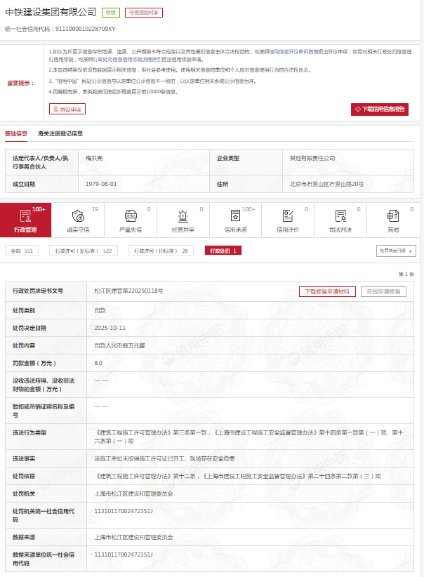 行政处罚事件 - 公司因未取得施工许可证擅自开工及现场存在安全隐患被上海市松江区建设和管理委员会处罚[1] - 行政处罚罚款金额为8万元[1] - 处罚依据为《建筑工程施工许可管理办法》第十二条和《上海市建设工程施工安全监督管理办法》第二十四条第二款第(三)项[1] 公司背景与规模 - 公司是世界500强中国铁建股份有限公司旗下的房建旗舰企业[1] - 公司拥有建筑及市政施工总承包特级资质、房地产开发一级资质等11项行业最高等级资质[1] - 公司注册资本为35亿元[1] - 公司设有工程研究院和中国铁建绿色低碳产业技术研究院[1] - 公司在建项目超过600个,在施面积超过7000万平方米,员工人数超过1万人[1]