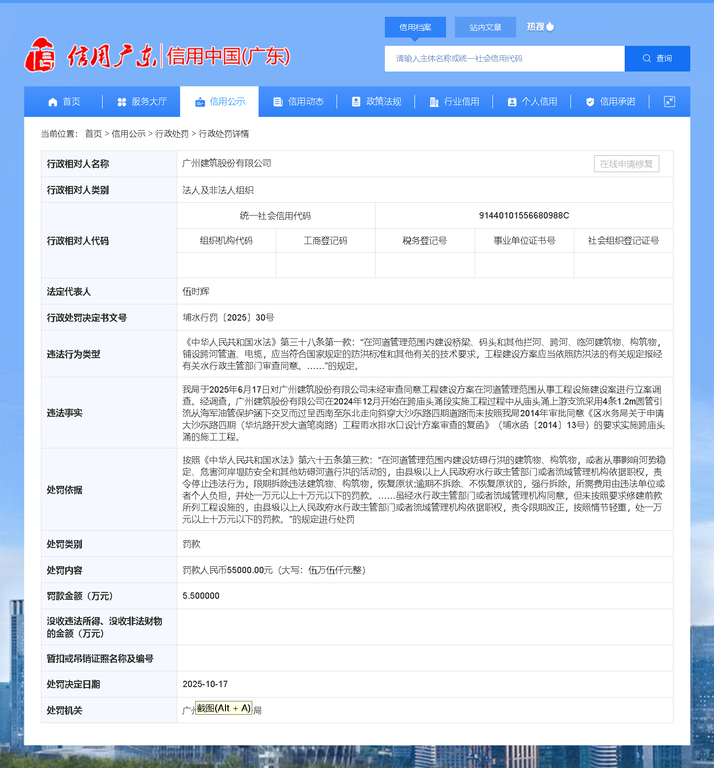 近日,齐鲁晚报·齐鲁壹点记者从信用广东获悉,广州建筑股份有限公司因未经审查同意工程建设方案在河道管理范围从事工程设施建设案被广州市黄埔区 水务局罚款5.5万元。 违法事实为:我局于2025年6月17日对广州建筑股份有限公司未经审查同意工程建设方案在河道管理范围从事工程设施建设案进行立案调查。经调查,广州 建筑股份有限公司在2024年12月开始在跨庙头涌段实施工程过程中从庙头涌上游支流采用4条1.2m圆管引流从海军油管保护涵下交叉而过呈西南至东北走向 斜穿大沙东路四期道路而未按照我局2014年审批同意《区水务局关于申请大沙东路四期(华坑路开发大道笔岗路)工程雨水排水口设计方案审查的复函》 (埔水函〔2014〕13号)的要求实施跨庙头涌的施工工程。 | | 信用档案 | CELLE 站内文章 | | --- | --- | --- | | 言 修用 アプリ 信用中国(广东) | | 请输入主体名称或统一社会信用代码 | | ● 首页 器 服务大厅 | 會 信用公示 目 信用动态 昌 政策法规 酮 行业信用 | 图 个人 | | 当前位置: 首页 > 信用公示 > 行政处罚 > 行政处罚详情 | | | | 行政相 ...