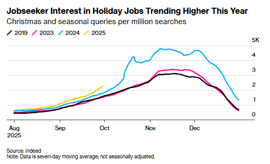 季节性求职趋势 - 截至9月底季节性岗位搜索量较去年同期增长27%较2023年激增50% [1] - 雇主发布的季节性岗位仅小幅增加27%导致临时性假日职位一岗难求 [1] - 季节性职位搜索量上升反映美国就业市场整体疲软呈现低招聘低解雇特征 [1] 就业市场压力信号 - 8月从事多份工作的人群占就业总人数的54%超过5%的需警惕区间 [1] - 从事多份工作人群比例上升是就业市场承压的信号 [1] - 人们积极外出找工作但可供选择的岗位数量变少 [1] 假日季招聘前景 - 再就业咨询公司预测今年最后三个月零售商新增季节性岗位可能不足50万个为2009年以来最低水平 [2] - 快递巨头联合包裹和联邦快递目前尚未公布今年假日季招聘计划 [2] - 亚马逊预计在旺季招聘25万名员工规模与过去两年持平 [2]