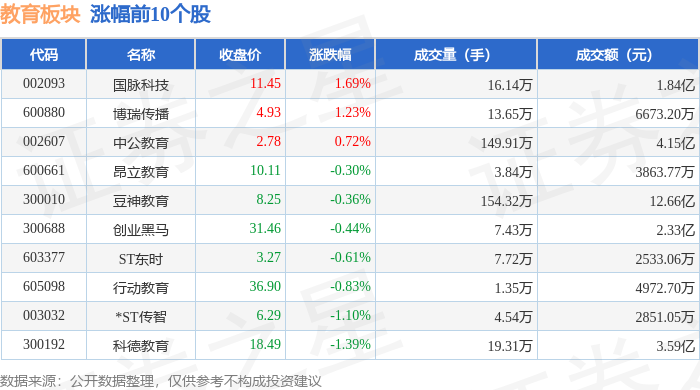 证券之星消息,10月9日教育板块较上一交易日下跌0.54%,凯文教育领跌。当日上证指数报收于 3933.97,上涨1.32%。深证成指报收于13725.56,上涨1.47%。教育板块个股涨跌见下表: | 代码 | 名称 | 收盘价 | 涨跌幅 | 成交量(手) | 成交额(元) | | | --- | --- | --- | --- | --- | --- | --- | | 002093 | 国脉科技 | 11.45 | 1.69% | 16.14万 | | 1.84亿 | | 600880 | 博瑞传播 | 4.93 | 1.23% | 13.65万 | 6673.20万 | | | 002607 | 中公教育 | 2.78 | 0.72% | 149.91万 | | 4.15 乙 | | 600661 | 昂立教育 | 10.11 | -0.30% | - 3.84万 | 3863.77万 | | | 300010 | 豆神教育 | 8.25 | -0.36% | 154.32万 | | 12.66亿 | | 300688 | 创业等司 | 31.46 | -0.44% | 7.43万 | | 2.33 ...