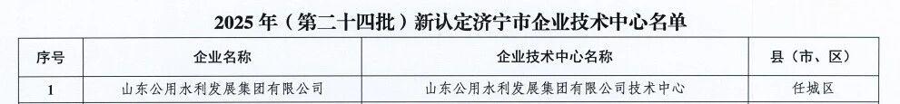 山东公用水利发展集团有限公司技术中心被认定为市级企业技术中心