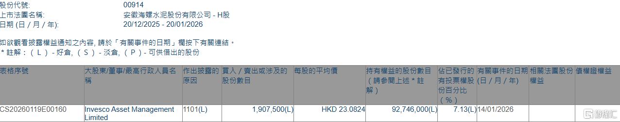 海螺水泥(00914.HK)获Invesco Asset Management增持190.75万股