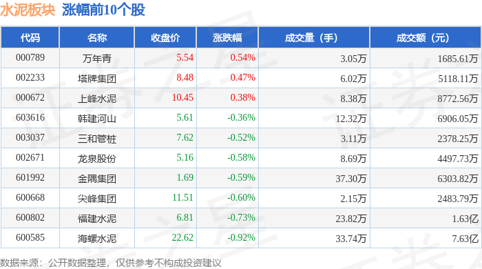 证券之星消息,11月27日水泥板块较上一交易日下跌1.29%,国统股份领跌。当日上证指数报收于 3875.26,上涨0.29%。深证成指报收于12875.19,下跌0.25%。水泥板块个股涨跌见下表: | 代码 | 名称 | 收盘价 | 涨跌幅 | 成交量(手) | | 成交额(元) | | --- | --- | --- | --- | --- | --- | --- | | 000789 | 万年青 | 5.54 | 0.54% | | 3.05万 | 1685.61万 | | 002233 | 塔牌集团 | 8.48 | 0.47% | | 6.02万 | 5118.11万 | | 000672 | 上峰水泥 | 10.45 | 0.38% | | 8.38万 | 8772.56万 | | 603616 | 韩建河山 | 5.61 | -0.36% | P | 12.32万 | 6906.05万 | | 003037 | 三和菅桩 | 7.62 | -0.52% | | 3.11万 | 2378.25万 | | 002671 | 龙泉股份 | 5.16 | -0.58% | | 8.69万 | 4497 ...