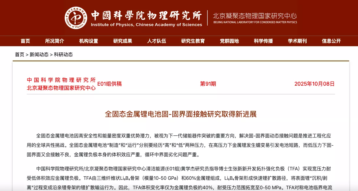 据央视新闻,近日,我国科学家成功攻克了全固态金属锂电池的 "卡脖子"难关,让固态电池性能实现跨越式升级,有望解决固固界面的接触难题,彻底打 通固态电池的续航瓶颈。 在基础研究取得关键进展的同时,产业层面的合作与落地也在同步推进。近日,丰田汽车官宣与住友金属矿山达成合作,共同推进下一代电池技术研发。 突破关键技术解决难题 中国科研团队在固态电池基础研究领域取得了关键进展。 据中国科学院物理研究所官网科研动态信息,由该所研究员黄学杰团队联合华中科技大学、中国科学院宁波材料技术与工程研究所等组成的研究团队开发出 一种阴离子调控技术,解决了全固态金属锂电池中电解质和锂电极之间难以紧密接触的难题。 固态电池作为下一代锂电池的核心技术方向,在新能源汽车、低空经济等领域具备广阔的应用前景。 从技术角度来看,据新华社报道,固态电解质与金属锂电极的界面接触问题一直是制约其产业化的难题。传统做法依靠笨重的外部设备持续施压,但锂电极 和电解质之间仍然存在大量微小孔隙和裂缝——这不仅会缩短电池寿命,还可能带来安全隐患。 图源:中国科学院物理研究所官网 针对技术挑战问题,中国科学院物理研究所官网文件指出,全固态金属锂电池"制造"和"运 ...