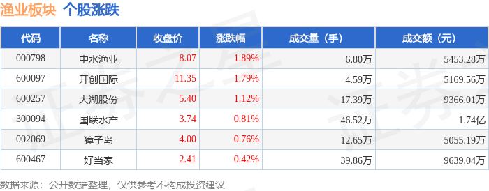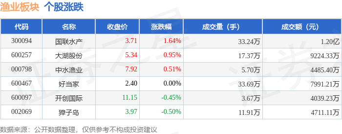 证券之星消息,10月13日渔业板块较上一交易日上涨0.43%,国联水产领涨。当日上证指数报收于 3889.5,下跌0.19%。深证成指报收于13231.47,下跌0.93%。渔业板块个股涨跌见下表: | 代码 | 名称 | 收盘价 | 涨跌幅 | 成交量(手) | 成交额(元) | | --- | --- | --- | --- | --- | --- | | 300094 | 国联水产 | 3.71 | 1.64% | 33.24万 | 1.20亿 | | 600257 | 大湖股份 | 5.34 | 0.95% | 17.37万 | 9224.33万 | | 000798 | 中水渔业 | 7.92 | 0.51% | 5.70万 | 4485.40万 | | 600467 | 好当家 | 2.40 | 0.00% | 33.69万 | 7991.21万 | | 600097 | 开创国际 | 11.15 | -0.45% | 3.67万 | 4039.23万 | | 002069 | 獐子岛 | 3.97 | -0.50% | 11.91万 | 4711.11万 | 以上内容为证券之星据公开信息整理,由 ...