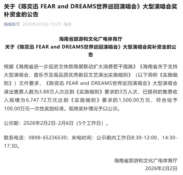 海南省演唱会奖补政策执行情况 - 海南省旅游和文化广电体育厅于2月2日公示了针对陈奕迅和张学友大型演唱会的奖补情况[1] 陈奕迅演唱会奖补详情 - 陈奕迅FEAR and DREAMS世界巡回演唱会达到奖补标准,获得一次性奖励100.00万元[3] - 该演唱会售票人数为3.88万人次,超过政策要求的3万人次[3] - 该演唱会提供的售票收入规模为6,747.72万元,超过政策要求的1,500.00万元[3] 张学友演唱会奖补详情 - 张学友60+巡回演唱会海口站达到奖补标准,获得一次性奖励50.00万元[6] - 该演唱会售票人数为2.29万人次,超过政策要求的2万人次[6] - 该演唱会提供的售票收入规模为4,303.45万元,超过政策要求的1,000.00万元[6]