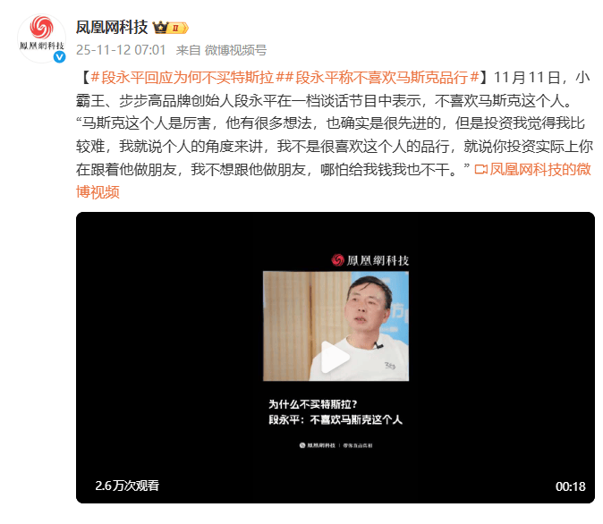 图源:微博 其实段永平早期是真喜欢特斯拉,车牌改成了"we love Tesla",还买过他们的股票。但后来体验不好,售后服务也不满意,再加上看马斯克做事风格飘忽, 有些承诺总兑现不了,慢慢就没了好感,干脆把股票全卖了。虽然后来段永平承认,卖股票可能是个错误决策,但就算重来,估计还是会坚持自己的原则。 11 月 12 日消息,小雷这两天发现,创投圈和公益圈被"中国巴菲特"段永平刷屏了。 一天之内搞了两个大动作:直言不买特斯拉股票是因为不喜欢马斯克的品行、向北师大捐赠 2.2 亿。 先说说段永平不碰特斯拉的事儿。在访谈里,主持人问他对特斯拉的看法有没有变,段永平的回答特别实在。他表示马斯克确实厉害,想法也先进,但他不 喜欢马斯克的品行,所以没法投资。 他还补了句关键的:投资实际上就是在跟公司经营者做朋友,我不想跟他做朋友,哪怕给我钱我也不干。 在资本圈里,大多人都是赚钱要紧,只要公司能盈利,经营者品行差点似乎也能忍。但段永平偏不,他把"三观契合"看得比短期收益还重。 这场访谈聊了俩小时,除了特斯拉,段永平还掏了不少实在干货。他反复说一句话:"买股票就是买公司",但真正能懂这话的人可能不到 1%。 核心就是投资得 ...