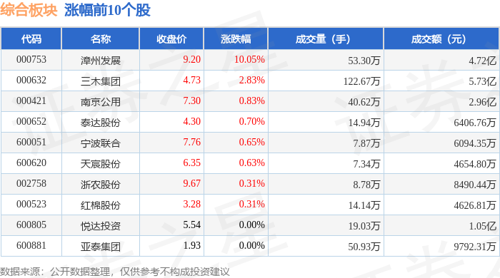 综合板块市场表现 - 11月4日综合板块整体下跌0.58%,表现弱于上证指数(下跌0.41%)和深证成指(下跌1.71%)[1] - 板块内个股表现分化,漳州发展以10.05%的涨幅领涨,粤桂股份以4.16%的跌幅领跌[1][2] - 漳州发展成交额达4.72亿元,成交量53.30万手,为当日板块内涨幅最大个股[1] 个股价格变动 - 上涨个股中,三木集团上涨2.83%,南京公用上涨0.83%,泰达股份上涨0.70%[1] - 下跌个股中,上海三毛下跌2.81%,东阳光下跌2.06%,综艺股份下跌1.95%[2] - 悦达投资和亚泰集团股价持平,涨跌幅为0.00%[1][2] 资金流向分析 - 综合板块整体呈现主力资金净流出5870.47万元,游资资金净流出358.44万元,散户资金净流入6228.9万元[2] - 漳州发展获得主力资金净流入1.38亿元,主力净占比达29.20%,但游资和散户资金分别净流出6328.75万元和7458.77万元[3] - 三木集团主力资金净流入4089.83万元,主力净占比7.14%,游资净流入2321.71万元[3] - 粤桂股份、上海三毛、东阳光等下跌个股均出现主力资金净流出[2]