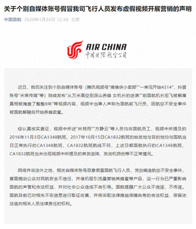 网络并非法外之地,相关自媒体账号恶意假冒国航飞行人员、凭空编造航空不安全事件,意图煽动公众 对民航安全不信任,并借机吸引流量营销其蜂蜜等产品,这一行为已严重影响国航的声誉和合法权益, 并对社会公众造成不良引导。国航提醒广大公众不信谣、不传谣。国航目前已对相关不实信息进行取证 收集,并将采取法律措施保障自身的合法权益,保留依法追究相关人员法律责任的权利。 近日,我司关注到个别自媒体账号(腾讯视频号"猪猪侠小卖部""一束花开始4314",抖音账号"米莱传 媒"等)陆续发布"从万米高空到深山养蜂 女机长的逆袭""前国航机长拒飞被解雇 真相被掩盖了整整8 年"等视频内容,视频中当事人声称为国航前飞行员,因航空不安全事件被国航解聘后开始养蜂卖蜜。 经认真核实查证,视频中所述"林筱雨""方静云"等人员均非国航员工,视频中所提及的2016年11月3日 CA1348航班、2017年10月15日CA1832航班的始发地与目的地均与国航当日正常执行的CA1348航班、 CA1832航班航线不符,上述日期国航执行的CA1348航班、CA1832航班也未出现视频中所提及的单发 迫降、发动机损伤等不正常情况。 ...