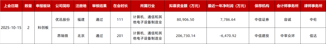 本篇中,汉鼎咨询结合申报材料、反馈问询期间监管问询关注点及上市委现场审议问题,对今日昂瑞微的基本情况及监管重点关注事项进行了梳理分析。 具体来看,昂瑞微科创板IPO于2025年3月28日获上交所受理,公司目前尚未盈利。反馈问询期间,昂瑞微完成两轮审核问询答复,产品成长性、持续经 营能力、预计盈亏平衡点及经销模式等问题被反复追问,且今日审议会议现场上市委也就相关问题提出疑问。 本周IPO审核结果 据交上交所官网审核动态信息,今日2家企业IPO上会,全部获审核通过,合计拟募资28.76亿元。 | 上会日期 数量 申报板块 公司简称 注册地 审核结果 在会时长 | | | | | | | 所属行业 | 拟募资金额 (万元) | 最近一年净利润(万元) | 保存机构 | 会计师事务所 律师事务所 | | | --- | --- | --- | --- | --- | --- | --- | --- | --- | --- | --- | --- | --- | | 2025-10-15 | 2 | 科创板 | 优迅股份 | 福建 | 通过 | 111 | 计算机、通信和其 他电子设备制造业 | 80,906.50 | ...