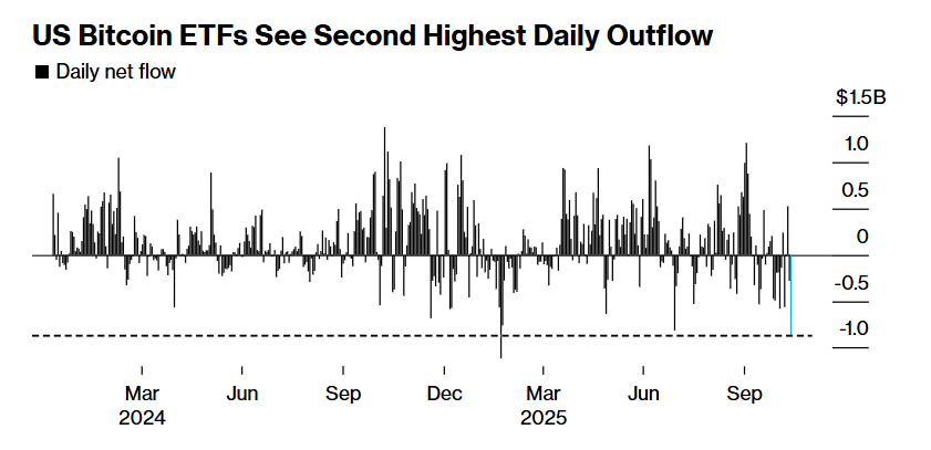 比特币市场表现与价格动态 - 比特币价格一度下跌多达2.8%,跌至9.6万美元下方,随后徘徊在97,070美元附近,较10月初的历史最高点下跌逾20%,进入熊市区域 [1] - 比特币跌破10万美元重要关口后,跌幅呈现持续加深态势 [1] - 从当前位置到9万美元出头区间之间缺乏显著的技术支撑 [4] 比特币ETF资金流向 - 投资于比特币的ETF基金出现大约8.7亿美元的单日净流出,创下自2024年1月初面世以来第二大的单日赎回规模 [2][3] - 比特币ETF自今年以来是全球股票市场最热门的投资板块之一,但近期出现大规模资金撤离 [1][2] 加密货币市场整体状况 - 全球加密货币市场在10月10日出现高达190亿美元的强平规模,导致全球所有加密货币总市值被抹去逾1万亿美元 [2] - 过去24小时内,又有超过10亿美元的加密货币杠杆仓位被强行清空,强平趋势仍在继续 [2] - 整体加密货币总市值年初至今已原地折返 [4] 市场流动性与交易环境 - 市场深度(衡量市场吸收大额交易而不出现大幅波动的能力)较今年高点大幅下降了约30% [3] - 距中间价1%范围内的比特币成交量自10月10日崩跌以来已收缩 [4] - 在期权市场,交易员们越来越倾向于为剧烈波动性进行布局,对勒式和跨式等中性对冲期权策略的需求正在上升 [4] 宏观风险与市场情绪驱动因素 - 比特币抛售与其他风险资产同步,但由于加密货币固有的更高波动性,其跌幅更大 [3] - 交易员开始质疑美联储的降息理由,这种“再评估进程”给高估值科技股和加密货币等风险资产带来新的压力 [3] - 市场担忧美国政府结束停摆后密集公布的经济数据(如CPI与非农)若不及预期,可能加剧风险资产抛售 [3] - 比特币下跌趋势的核心被归结为“盲从型投机者”基本消失,即“接盘”的短线投机者越来越少,出现“顶部需求塌陷” [1]