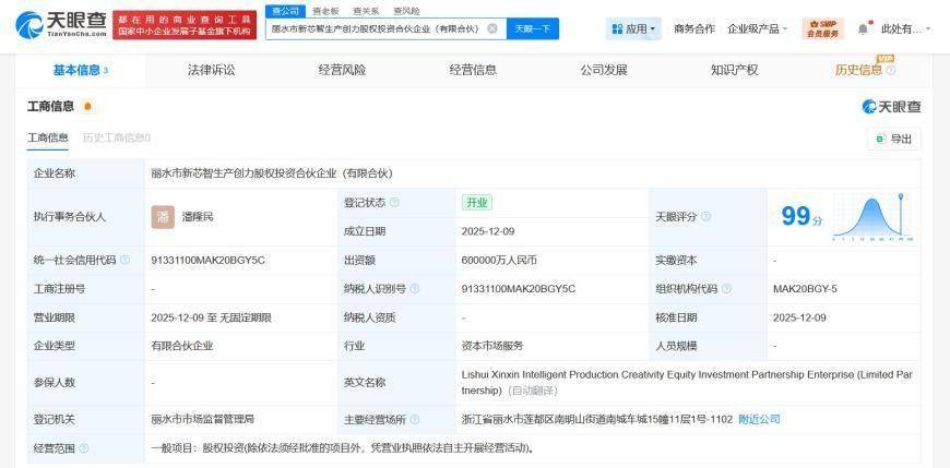 丽水市新芯智生产创力股权投资合伙企业成立 出资额60亿