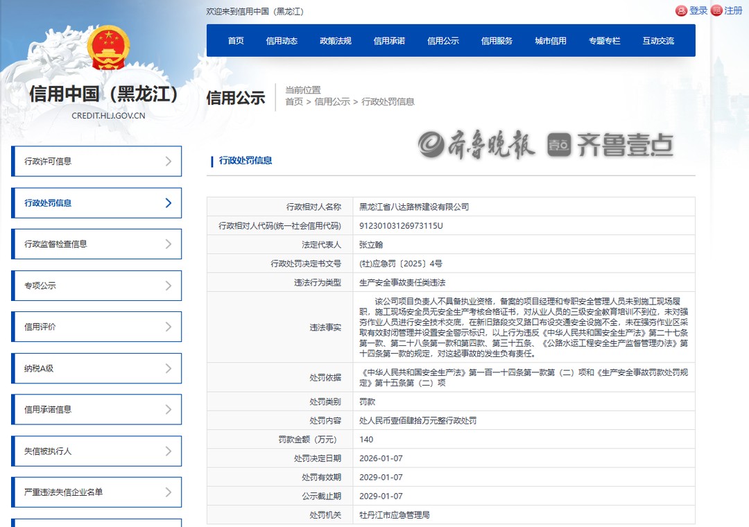 公司概况 - 公司全称为黑龙江省八达路桥建设有限公司,是黑龙江省交通投资集团有限公司的权属公司 [2] - 公司成立于1991年,是一家以基础设施投资、建设、运营为主的综合性国有企业 [2] - 公司注册资本为10亿元,现有职工约700人,年施工能力超过50亿元 [2] - 公司下辖52家全资、控股分子公司及参股公司 [2] 行政处罚事件 - 公司因生产安全事故责任类违法,被牡丹江市应急管理局处以140万元人民币的罚款 [1][2] - 行政处罚决定书文号为 (牡)应急罚 [2025] 4号,处罚决定日期为2026年1月7日 [2] - 处罚有效期与公示截止期均为2029年1月7日 [2] 违法事实详情 - 项目负责人不具备执业资格,且备案的项目经理和专职安全管理人员未到施工现场履职 [1][2] - 施工现场安全员无安全生产考核合格证书 [1][2] - 对从业人员的三级安全教育培训不到位,且未对强夯作业人员进行安全技术交底 [1][2] - 在新旧路段交叉路口布设的交通安全设施不全 [1][2] - 未在强夯作业区采取有效封闭管理并设置安全警示标识 [1][2] 法律依据 - 上述行为违反了《中华人民共和国安全生产法》第二十七条第一款、第二十八条第一款和第四款、第三十五条 [1][2] - 同时违反了《公路水运工程安全生产监督管理办法》第十四条第一款的规定 [1][2] - 处罚依据为《中华人民共和国安全生产法》第一百一十四条第一款第(二)项和《生产安全事故罚款处罚规定》第十五条第 (二)项 [2]