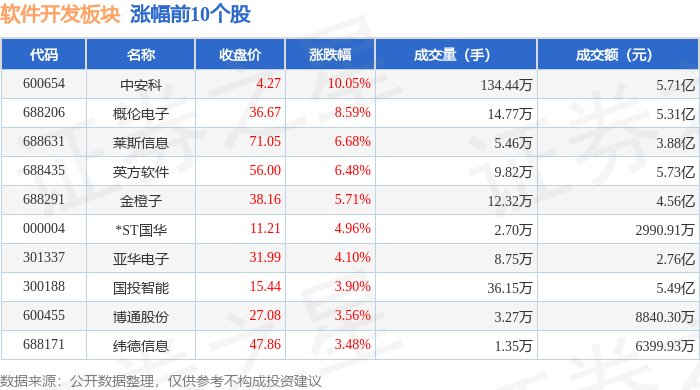 | 代码 | 名称 | 收盘价 | 涨跌幅 | 成交量(手) | 成交额(元) | | --- | --- | --- | --- | --- | --- | | 60188899 | 品客科技 | 153.38 | -12.10% | 3.68万 | 5.89 Z | | 301159 | 三维天地 | 42.21 | -10.69% | 16.52万 | 7.20亿 | | 002153 | 石墓信息 | 12.18 | -9.98% | 113.86万 | 14.12 乙 | | 300344 | ST立方 | 3.56 | -7.53% | - 46.39万 | 1.65亿 | | 300605 | 恒锋信息 | 18.27 | -6.69% | 20.54万 | 3.78亿 | | 002279 | 久其软件 | 8.98 | -5.47% | 176.61万 | 16.14亿 | | 002178 | 延祥智能 | 7.36 | -5.40% | 130.30万 | 9.80亿 | | 300598 | 诚迈科技 | 49.20 | -3.93% | 12.42万 | 6.22亿 | | 3006 ...
