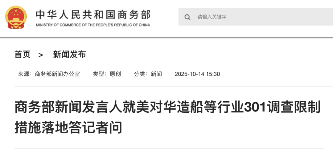 今天,商务部新闻发言人就美对华造船等行业301调查限制措施落地答记者问。 为进一步维护中国相关产业利益,中方有关部门根据《中华人民共和国国家安全法》《中华人民共和国 反外国制裁法》《中华人民共和国国际海运条例》等有关规定,将部分协助、支持美方相关调查活动的 企业列入反制清单,对美国及部分国家和企业危害我国航运、造船等相关产业安全发展利益的行为发起 调查。在调查实施过程中,中方将秉承公开、公平、公正原则开展执法和调查,充分保障各利害关系方 权利。 中方在相关问题上的立场是明确的、一贯的,打,奉陪到底;谈,大门敞开。中方敦促美方纠正错误做 法,与中方相向而行,通过平等对话协商方式解决双方关切的问题。 (责任编辑:朱赫) 有记者问:美东时间10月14日,美国依据所谓301调查结果,正式对中国海事、物流和造船领域实施港 口费等限制措施,请问中方对此有何回应? 答:美方措施是典型单边主义、保护主义行为,严重违反世贸组织规则,违背《中美海运协定》平等互 惠原则,赋予相关国家航运和造船企业不公平竞争优势,构成对中国航运、造船等产业的歧视性做法, 严重损害中国相关产业利益。中方对此强烈不满,坚决反对,已于10月10日宣布将对 ...
