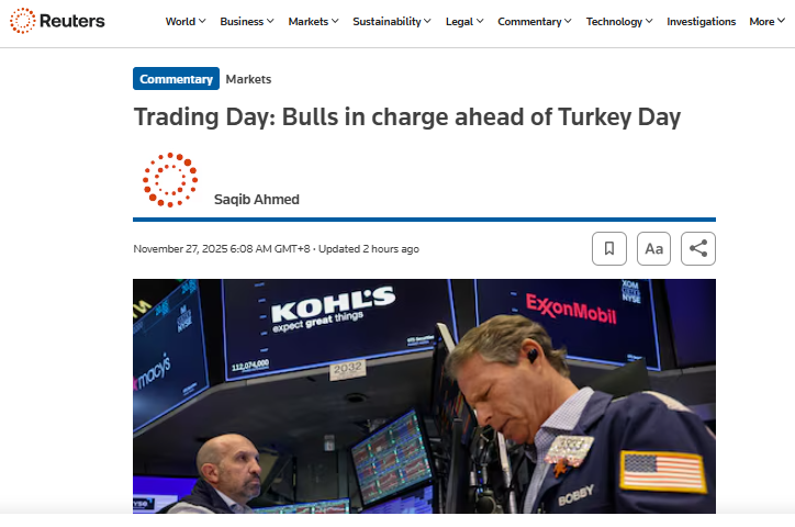 【环球网财经综合报道】北京时间11月27日凌晨,美国三大股指全线收涨,道指涨0.67%报47427.12 点,标普500指数涨0.69%报6812.61点,纳指涨0.82%报23214.69点,均录得连续第四日上涨。波音涨超 2%,沃尔玛涨近2%,领涨道指。万得美国科技七巨头指数涨0.46%,微软、特斯拉涨超1.5%。 路透社报道称,感恩节前,华尔街连续第四天上涨,旧金山联储行长言论强化了12月降息,以及就业市 场稳健预期,带动科技股引领反弹,但交易清淡和流动性较低可能会导致行情大幅波动。 报道还提到,美国经济正巧妙地保持平衡:没有崩溃,但又足够疲软,为美联储继续降息留出空间。 摩根大通则发布了华尔街最乐观预测,将2026年底标普500指数基础目标设为7500点,并指出在美联储 进一步放宽政策的条件下,标普500指数将有望突破8000点。当前由AI驱动的超级周期是摩根大通乐观 展望的核心。 ...