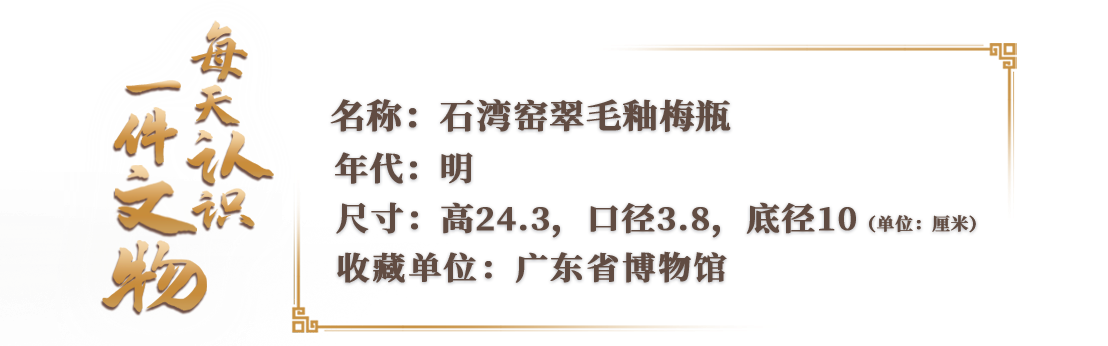 翠毛釉的艺术特征 - 翠毛釉因其视觉效果神似翠鸟羽毛而得名 [2] - 釉色在窑内烧制过程中不断流淌变化,形成深浅不一的蓝色间杂以自然流动的白色釉色 [4][9] - 色浓之处蓝釉中映紫彩,色淡之处如月白般清澈 [12] - 釉层厚而光润,完全包裹器物,不见陶胎痕迹,使厚重的梅瓶呈现出灵动轻盈的视觉效果 [15][16] 石湾窑“广钧”的工艺与起源 - 翠毛釉源自广东佛山石湾窑,石湾窑以仿宋代钧窑的窑变釉色为主,被称为“广钧” [15] - 据《竹园陶说》记载,明代良工仿制宋钧,以蓝釉中映紫彩者为最浓丽,粤人称之为翠毛蓝 [15] - 石湾窑“广钧”的特点是胎体厚重、胎色灰暗 [15] - 与钧窑不同,石湾窑为陶胎,钧窑为瓷胎 [18] - 施釉技法上,石湾窑为掩盖陶胎粗粒,需先施一层护胎釉再施釉,而钧窑为一次性施釉 [18] 石湾窑的历史地位与传承 - 石湾窑制陶历史最早可追溯到新石器时代晚期,唐宋时期已有规模化生产 [19] - 明代因商品经济和对外贸易发达,石湾窑进入鼎盛阶段,成为海内外知名窑口 [19] - 其艺术陶塑、建筑陶瓷、手工业用陶器等不断输出国外 [19] - 清代产品在岭南及东南亚地区广受青睐,《广东新语》记载“石湾之陶遍二广,旁及海外之国” [19] - 2006年,石湾陶塑技艺被列入第一批国家级非物质文化遗产名录 [20]
