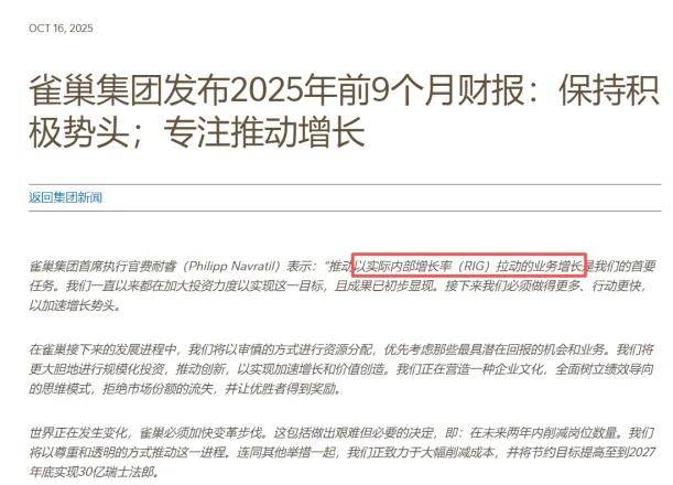 10月16日,国际食品巨头雀巢集团发布2025年前9个月财报。财报显示,公司前9个月总销售额为659亿瑞 士法郎,同比下降1.9%。有机增长率为3.3%,实际内部增长率增至0.6%,定价贡献率稳定在2.8%。汇率 变动带来了5.4%的负面影响,净收购则带来0.1%的正面影响。 同期财报会上,雀巢官宣将在全球范围内裁减约1.6万个岗位,以推动新任首席执行官菲利普·纳夫拉蒂尔 (Philipp Navratil)提出的成本削减计划。消息公布后,雀巢股价早盘一度飙升7%。 值得关注的是,前不久,如雀巢老将保罗·薄凯提前结束董事长任期,以及公司CEO的多次更迭等,雀巢 刚刚经历完管理层的人事大震荡。当下,雀巢又迎来普通员工层的大调整……雀巢的"多方位震荡"背后, 其是如何谋划的呢? 菲利普·纳夫拉蒂尔会上直言:"推动以实际内部增长率(RIG)拉动的业务增长是我们的首要任务。我们 一直以来都在加大投资力度以实现这一目标,且成果已初步显现。接下来我们必须做得更多、行动更快, 以加速增长势头。" 01 继续优化公司人员架构, 关于裁员,菲利普·纳夫拉蒂尔直言,"世界在改变,雀巢也必须加快变革步伐"。其进一步解释道,此次 裁 ...